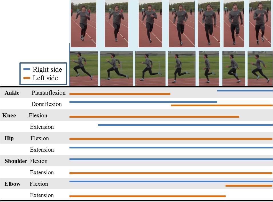 Running or sprinting consist in a series of functional movement, link and well sequenced to achieve performance. All the desirable movements are executed in the sagital plane of the body. Deviations from the orientation and amplitude of those movements can be attributed to weak-long problem with a pair of joint mover muscle. The list of the movement appear in the figure below. Note that some of the movements for some joints are not listed. Not that those muscles do not participate to the running movment but they are not producing movement at the joint level. Rather, they contract isometrically to stabilize the joint. If some of the movements not listed appear in the execution, it should be consider as a dysfunction and address. Keep in mind that the mobility or stability of the faulty joint might be adequate and that the dysfunction come from motor control, the athlete not timing or not using the movement correctly.